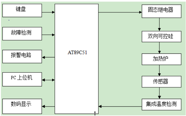 ◎ 該系統(tǒng)系詳細的作業(yè)原理是這么的:單片機守時對爐溫進行檢查,經(jīng)A/D改換后得到相應的數(shù)字量,送到計算機,計算機根據(jù)給定的操控規(guī)矩算法進行判別和運算,得到應有的操控量去操控加熱系統(tǒng)系,然后完結對溫度的操控。選用AT89C51單片機完結。